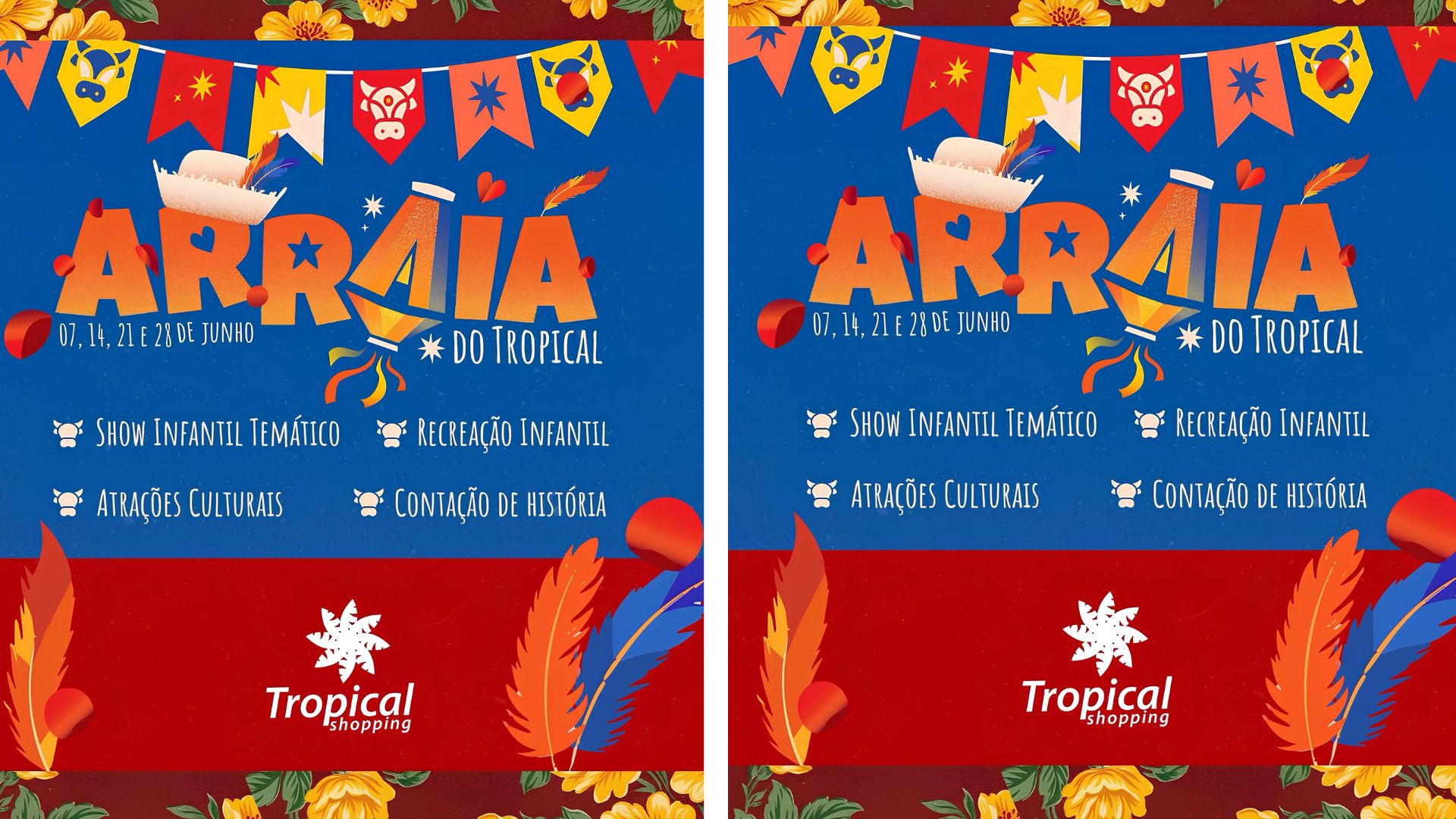 Sobretudo o Arraiá do Tropical aposta em criar um ambiente acolhedor e genuinamente junino, onde o público poderá relembrar tradições e viver momentos especiais. Além disso a decoração típica, repleta de bandeirinhas coloridas, fogueira cenográfica e barracas decoradas, complementará o cenário perfeito para fotos e lembranças inesquecíveis.