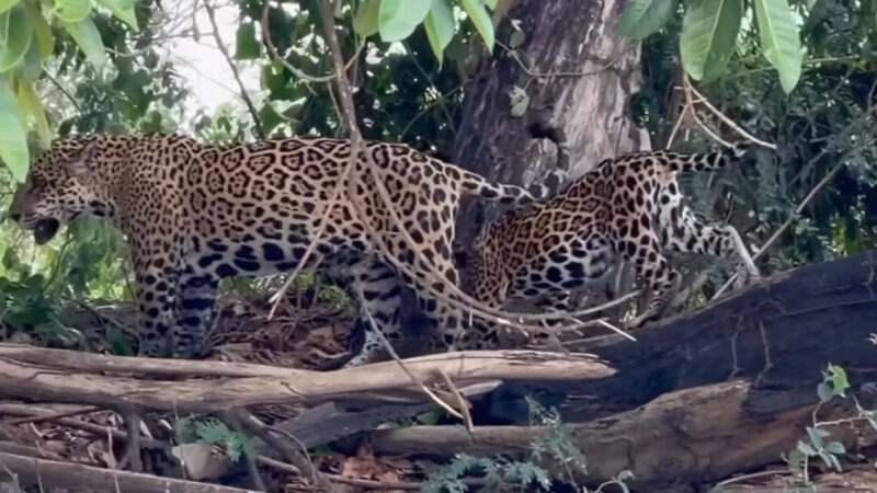 A onça-pintada utiliza troncos e galhos como pontos de observação e deslocamento. No vídeo, a mãe avalia o caminho antes de avançar e mantém postura tranquila. O filhote segue de perto e demonstra confiança durante o passeio.